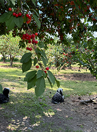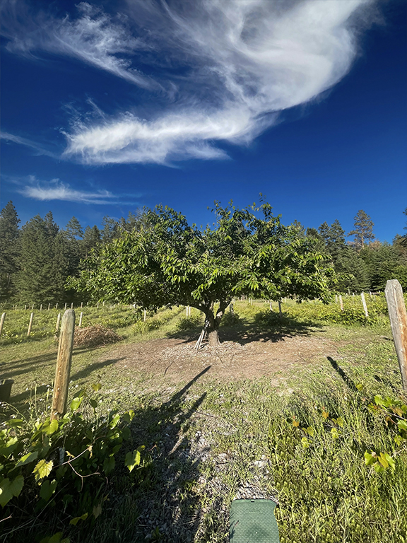 We understand you all will want to hear, quickly, about our upcoming harvest. In our orchard, we like to give some of our trees an extraordinary space for growth. This photo is of a special Lambert tree that survived historical winters when the entire area lost their trees. Enjoy this photo while you read our particulars.
