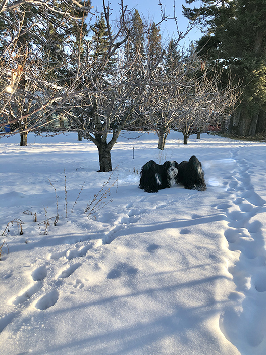We are keeping the fires burning while our trees remain dormant. Fences are watched, repairs are made after our significant winds this winter season. Sometimes a small ermine shows its face or a raccoon checks out the compost. Our Tibetan Terriers keep the orchard free of intruding coyotes or bigger, wildlife cats. The bears are sleeping. Our orchard birds are fed and the dogs get long walks. The kitchen is busy, big winter meals are cozy and relaxing. It is our time for artwork and the finishing on our house. We host friends and visitors for dinners. Our temperatures have been high. Generally, they have hovered around 34 degrees F. Last night, Feb.1, 2020, at midnight, our temperature was 47 degrees F.
