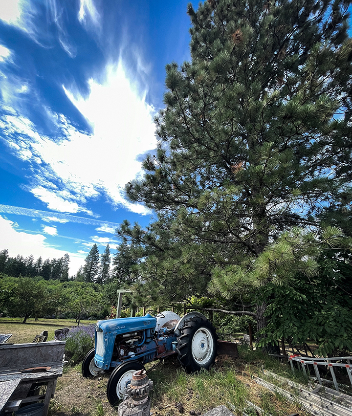 We understand you all will want to hear, quickly, about our upcoming harvest. In our orchard, we like to give some of our trees an extraordinary space for growth. This photo is of a special Lambert tree that survived historical winters when the entire area lost their trees. Enjoy this photo while you read our particulars.