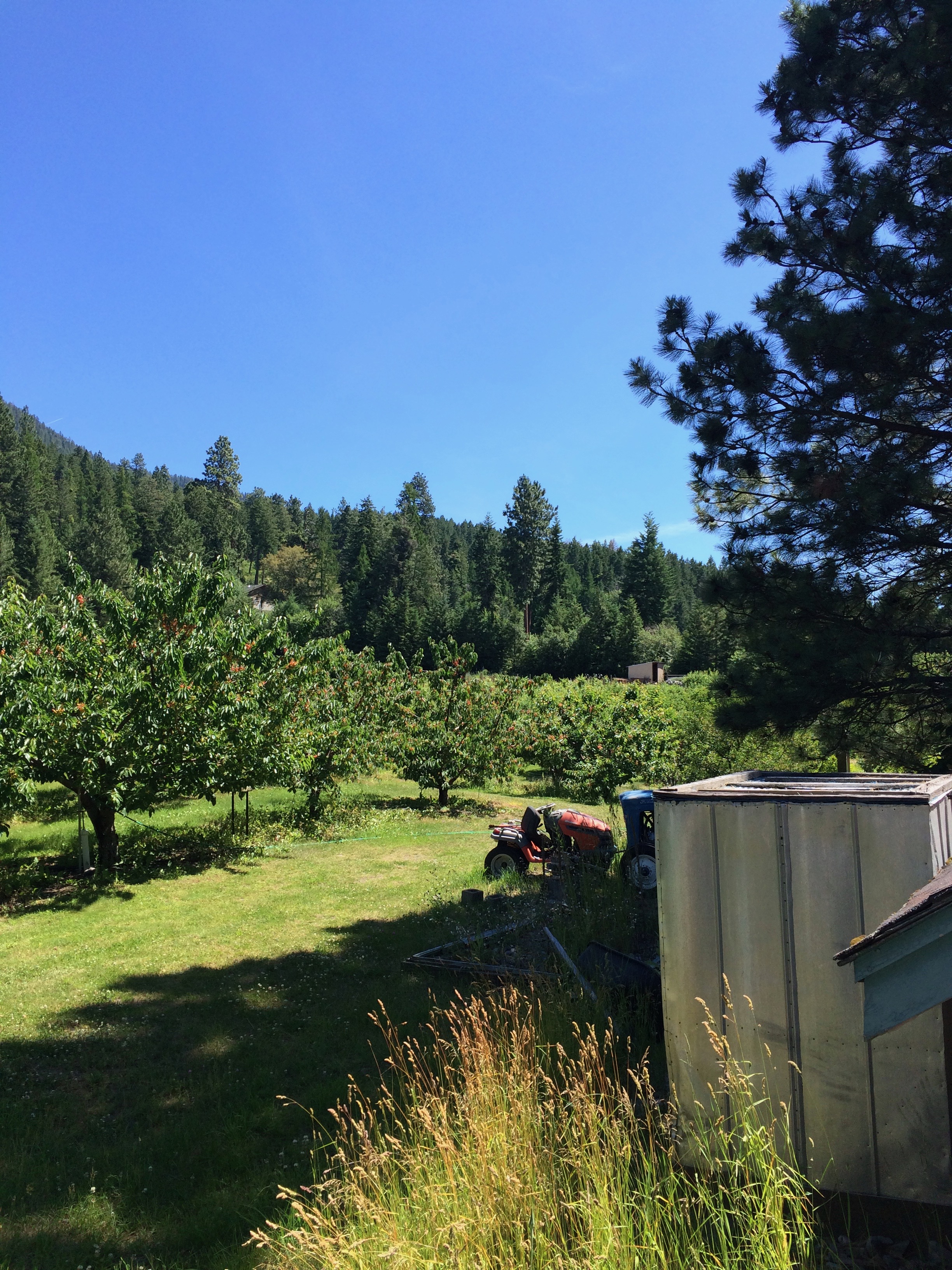 The Cherries are in June Drop and on their way to Straw. We are watering like mad and mowing. Dan has been clearing pathways and tending the grass that keeps the cherry trees moist.